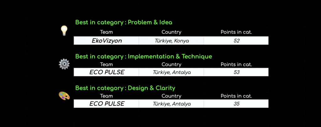 | Team Digital Nature 🇹🇷 Türkiye, İzmir Konak | Trainer: Berkay Esen – – – Umut Yusuf Yilmaz (13) – – – Yasmin Deniz Uğuz (11) – – – Emircan Yolacan (12) – – – Naz Akbaş (11) |